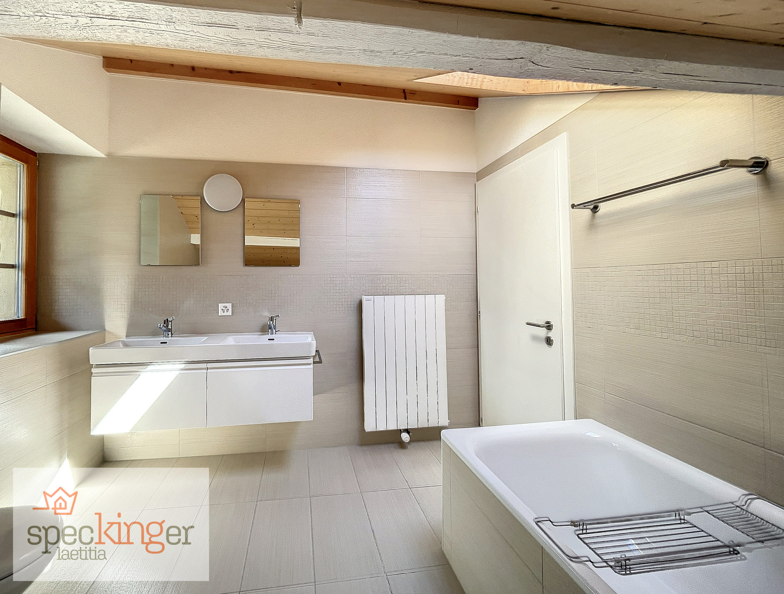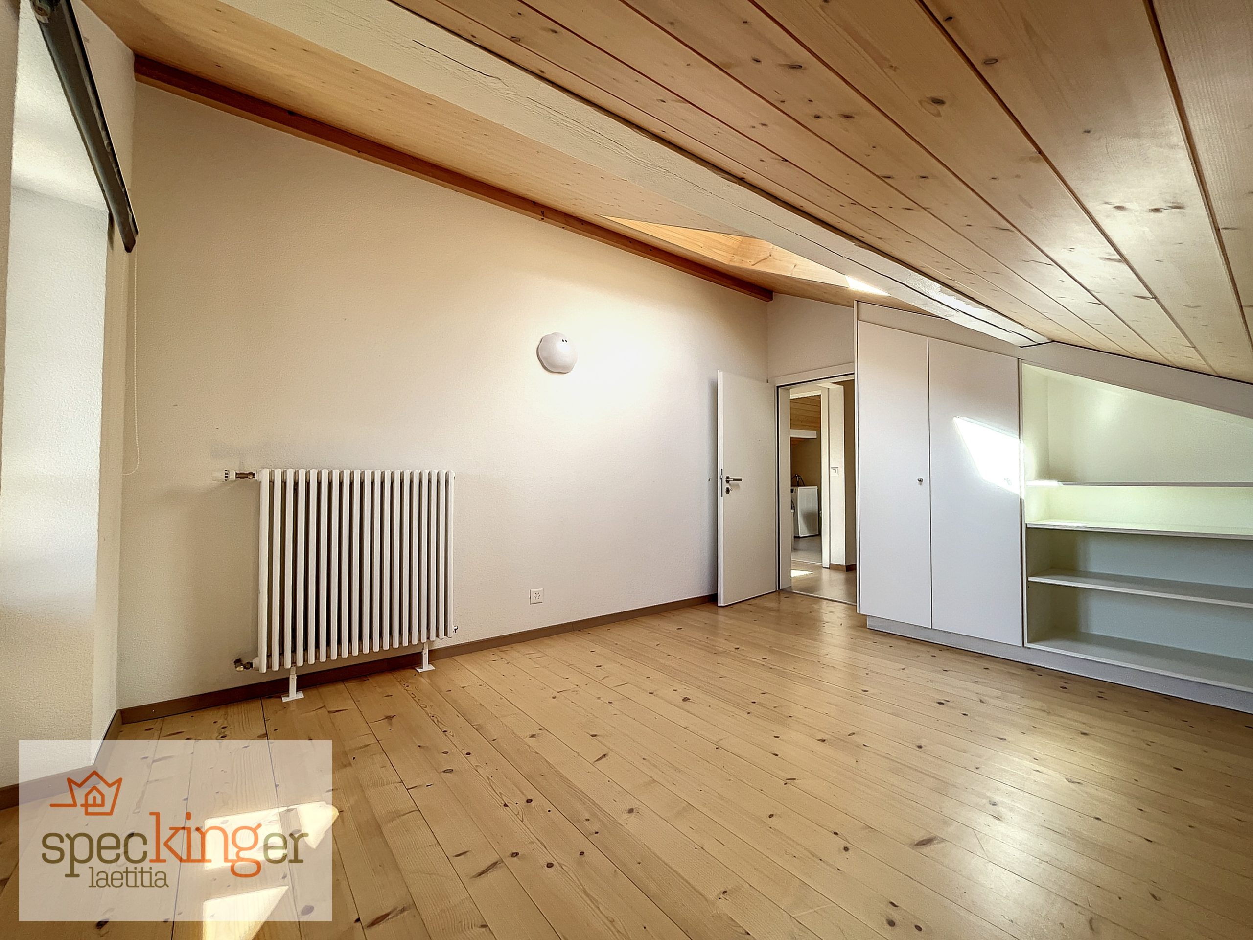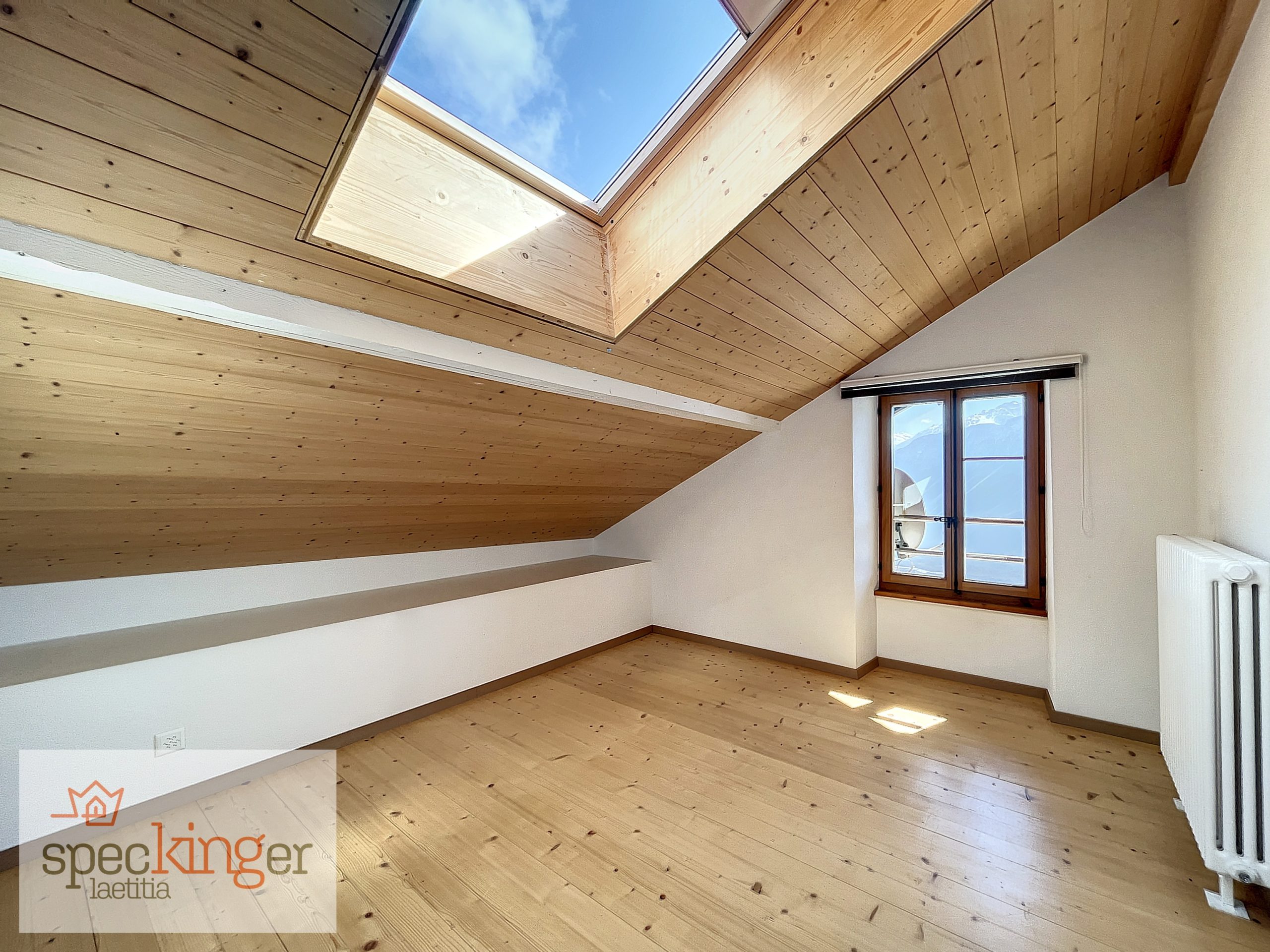 L’escalier situé au centre du logement permet d’accéder à l’étage, composé de 2 belles chambres avec armoires intégrées et vue sur la vallée et les montagnes, d’une petite chambre avec balcon NO et un réduit, d’une belle salle-de-bains avec meuble double vasque/WC et d’un petit local technique pour la chaudière.