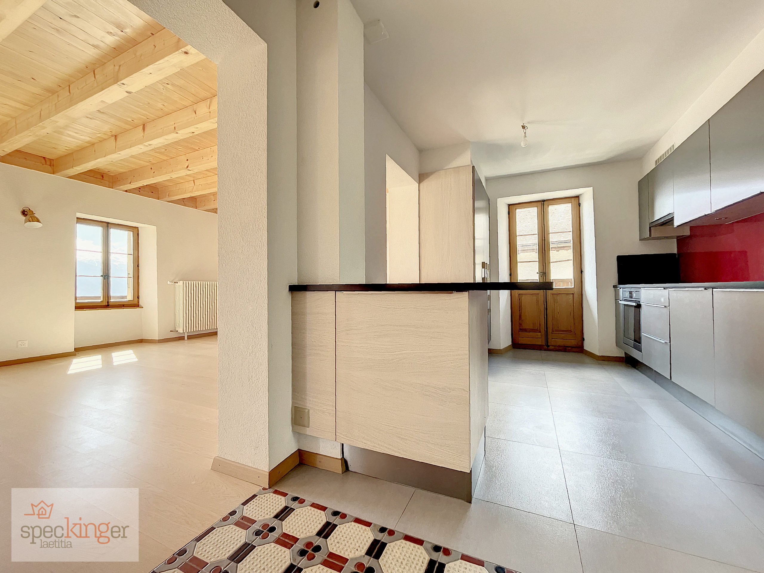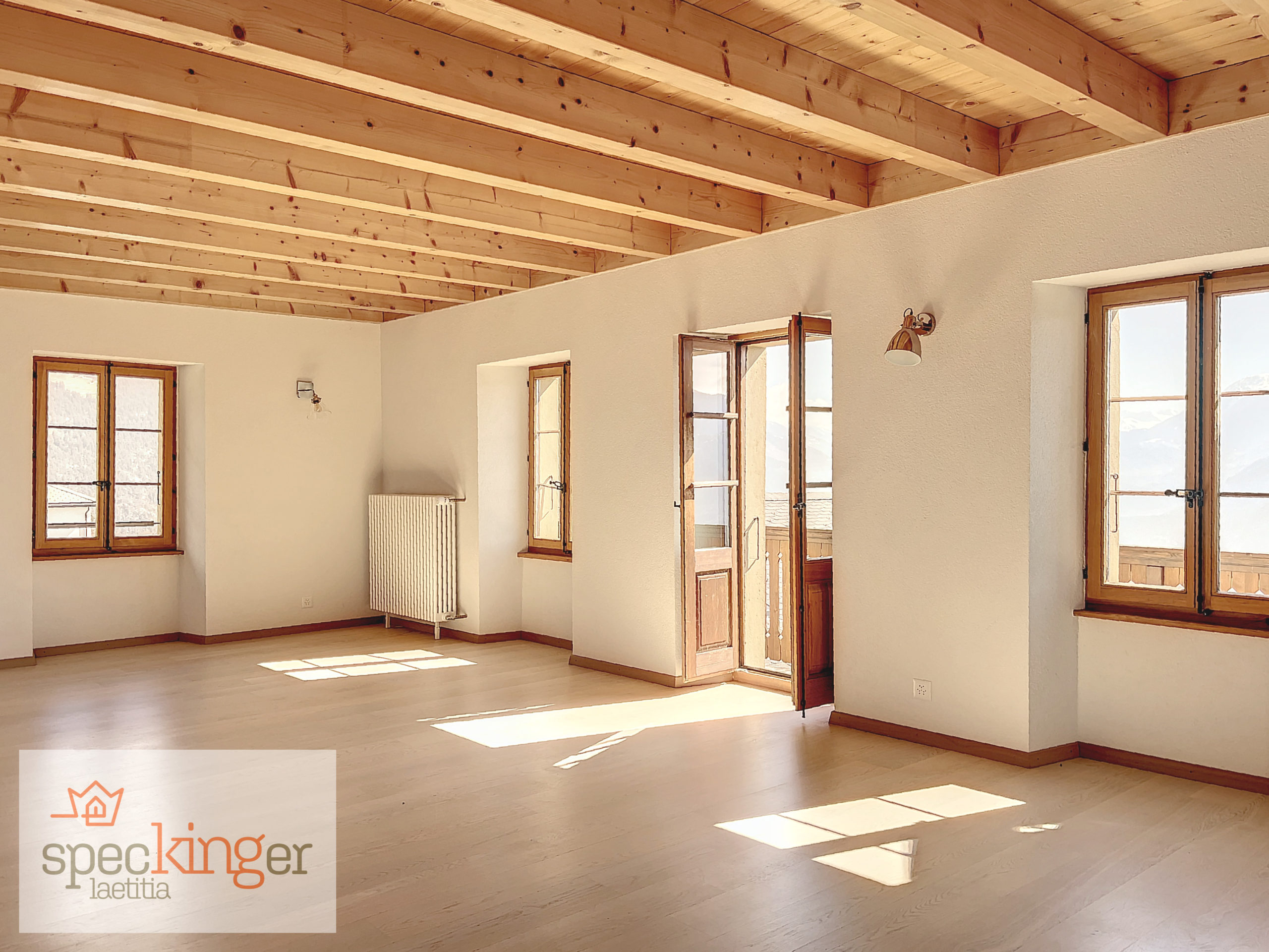 Le spacieux séjour bénéficie de nombreuses fenêtres et d’une porte-fenêtre permettant d’accéder au balcon et à son incroyable vue très enviée vers les 4 sommets de plus de 4000m d’altitude.